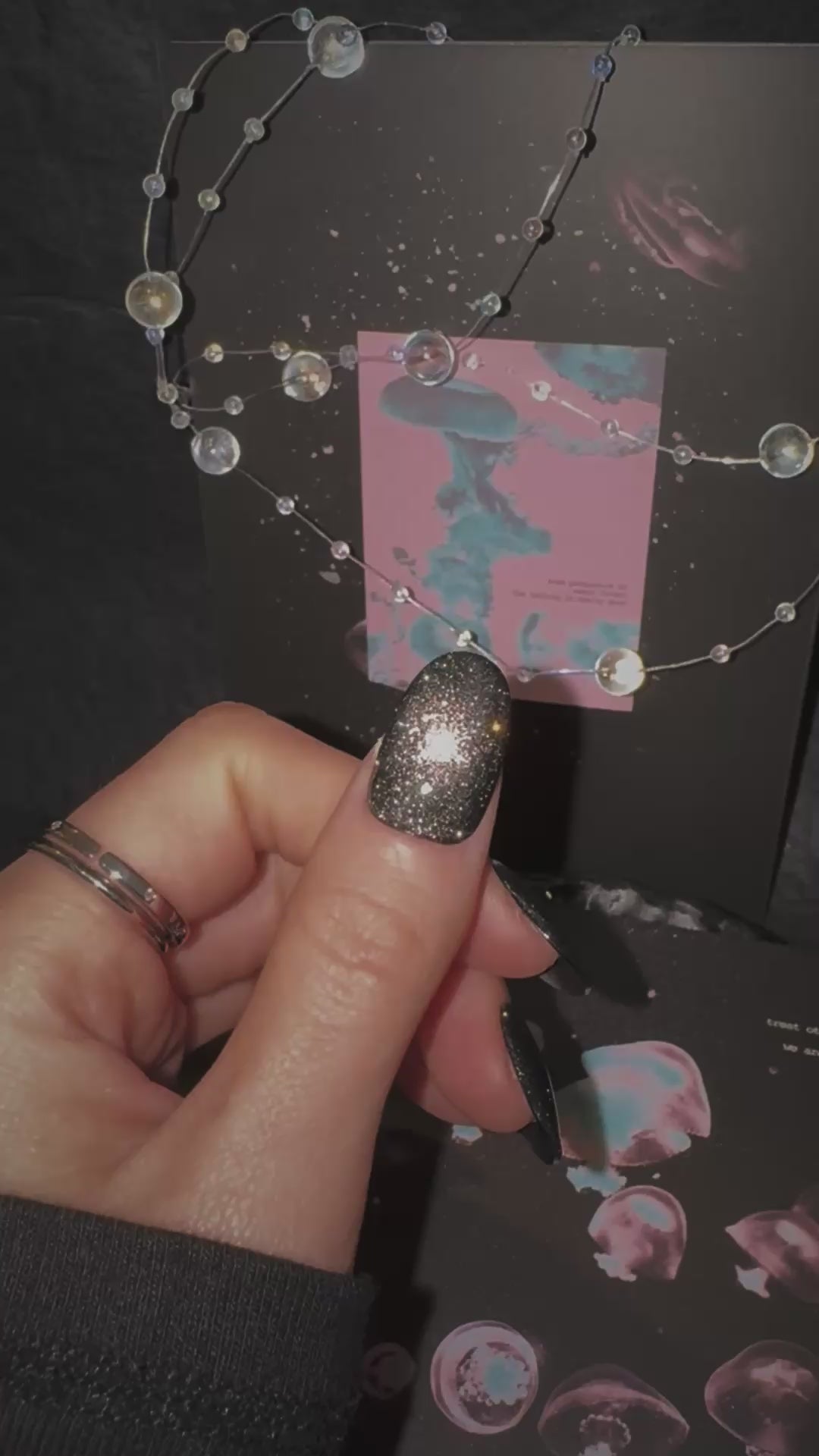 Silver galaxy shimmer suspended in midnight black, designed to glow wherever light finds you.